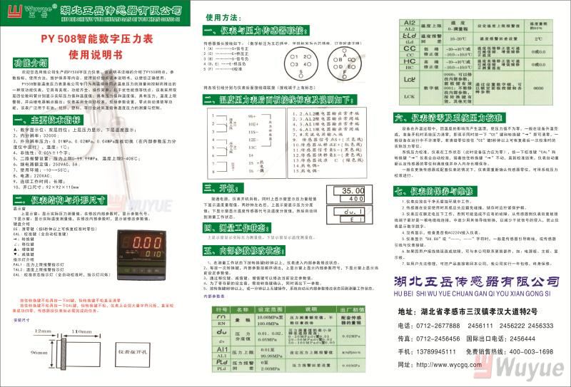 歡迎您選用湖北五岳傳感器有限公司生產的PY508/PY1508智能數(shù)字壓力儀表。該說明書詳細的介紹了PY508/PY1508的性能特點,參數(shù)指標,使用方法,維護保養(yǎng)等內容。使用前仔細閱讀本說明書,以便您正確使用。